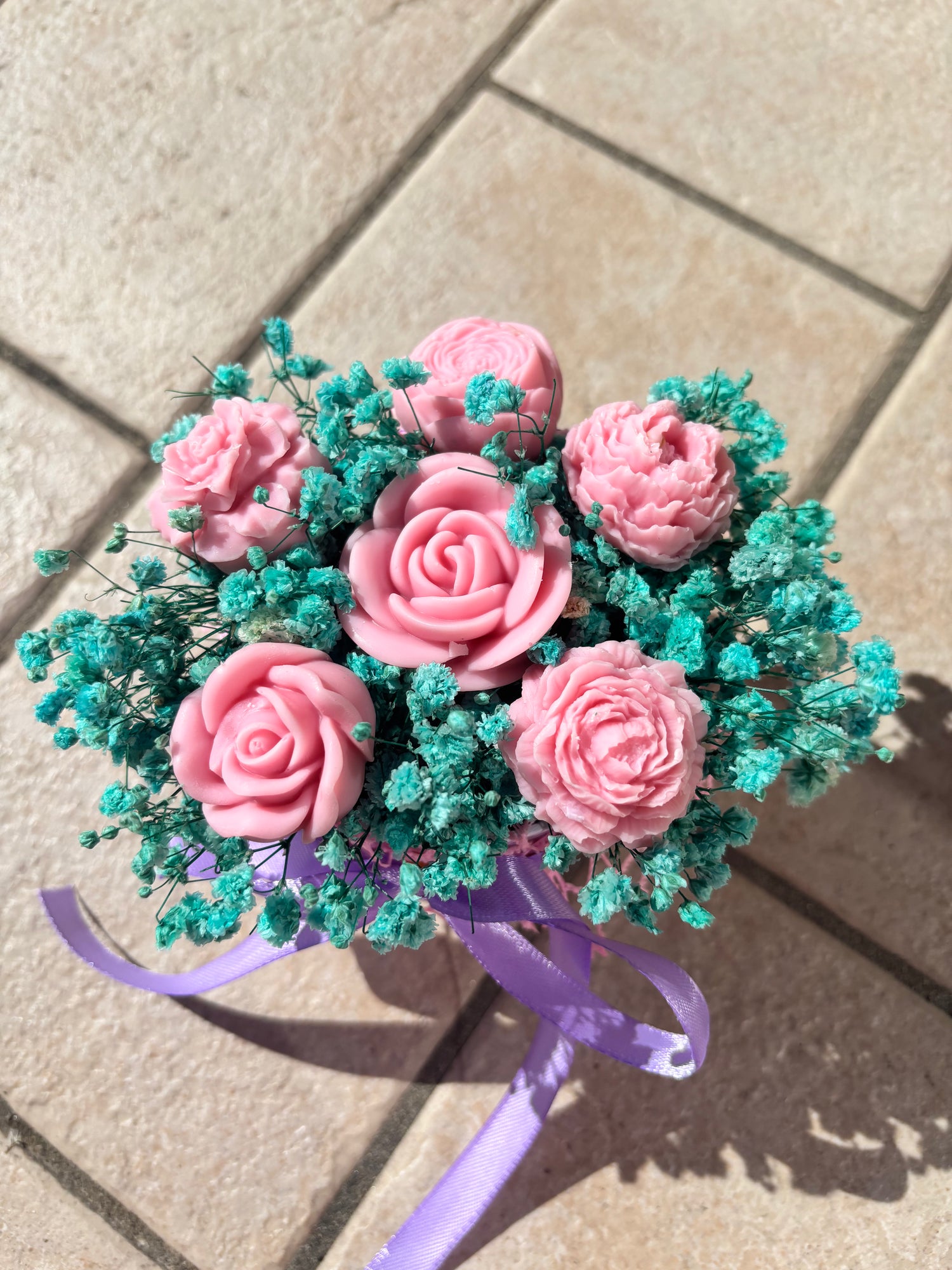 Un raffinato bouquet di candele in cera di soia, modellate a mano per riprodurre fiori delicati. Perfetto come decorazione o idea regalo, unisce arte e luce in un’unica creazione.