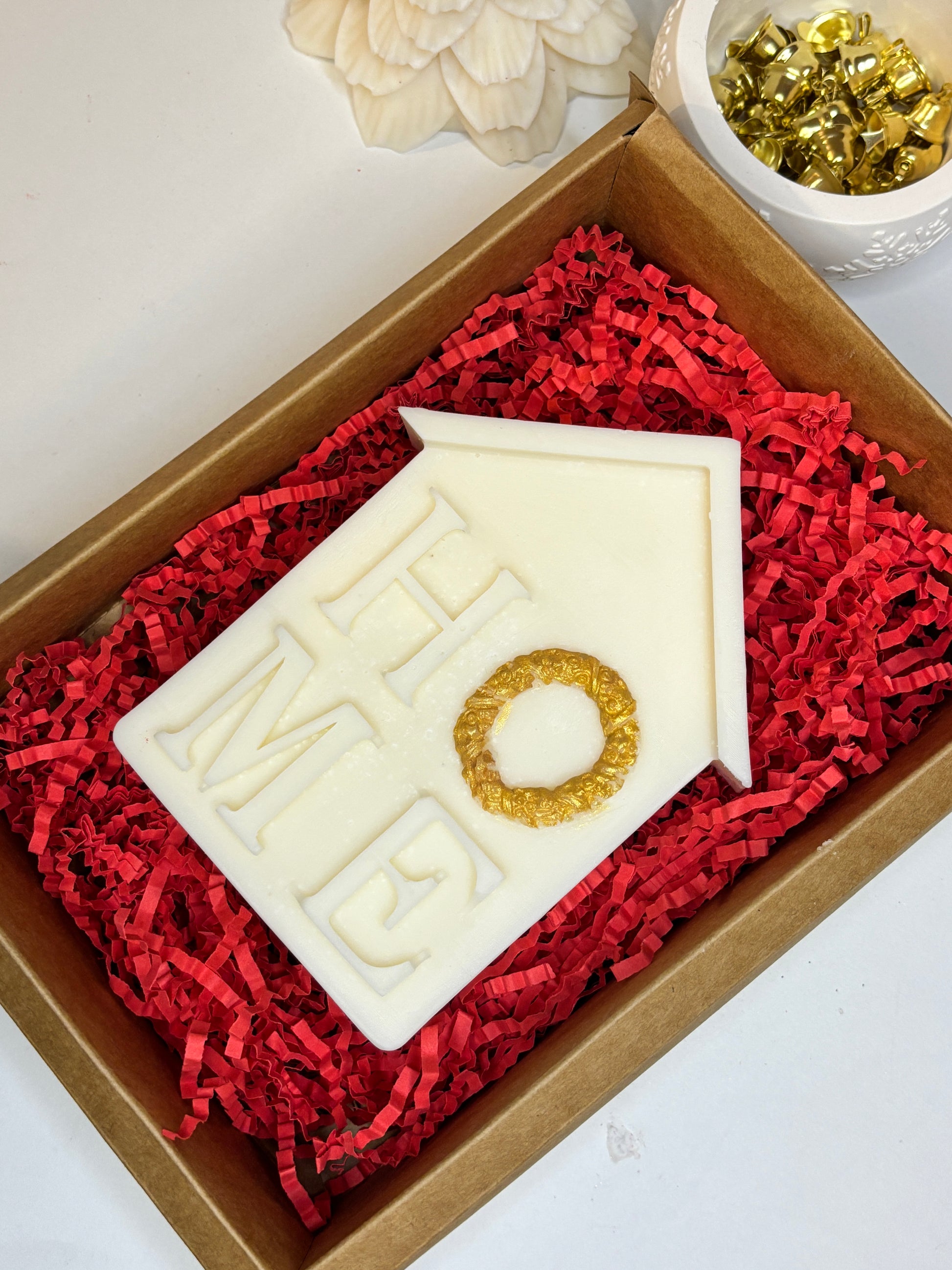 Celebra il calore della casa con questa originale candela targa a forma di tetto, che riporta in rilievo la parola HOME. Il dettaglio distintivo è la piccola ghirlanda dorata (o color oro) che funge da coronamento per il design. Realizzata in cera di soia di alta qualità, è un simbolo di accoglienza e un pezzo statement per il tuo salotto.