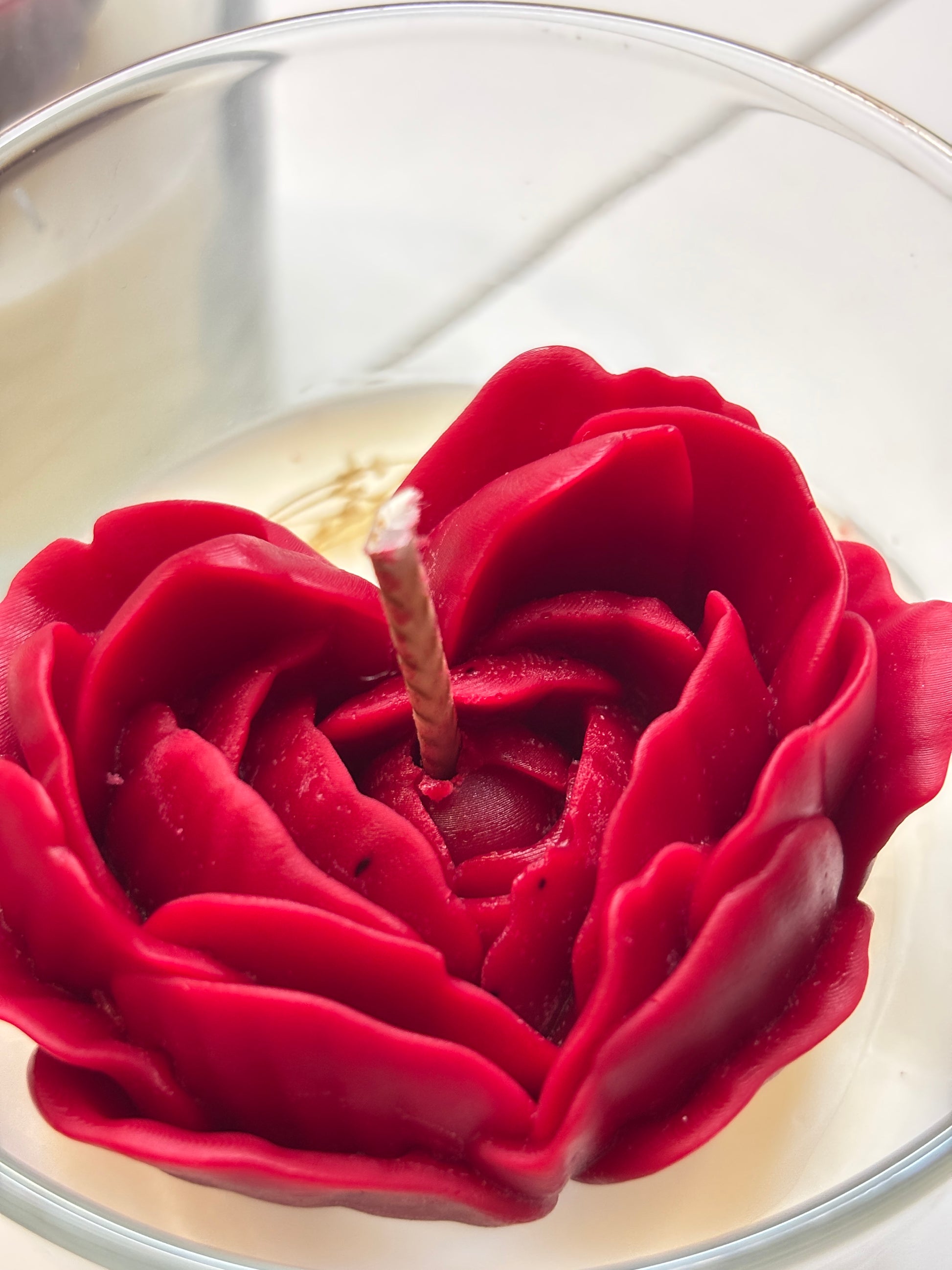 Una rosa che sboccia all'interno di un bicchiere di vetro, posata su una base di cera bianca.