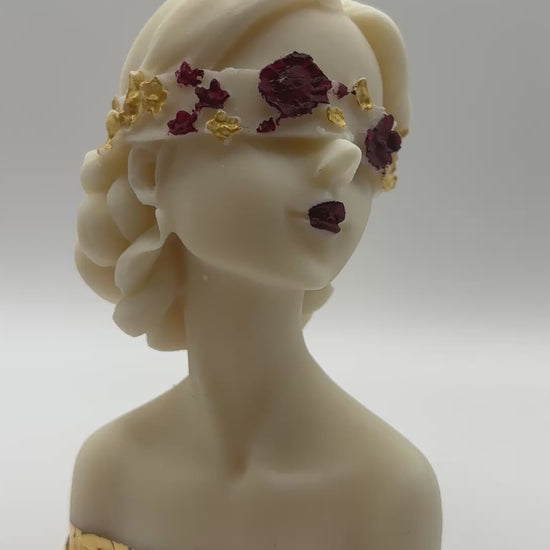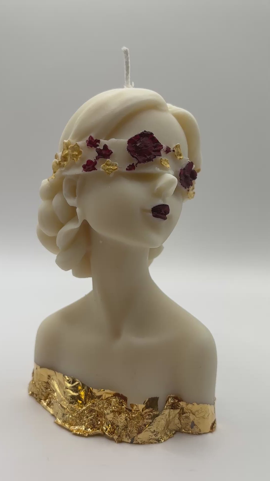 Aggiungi un tocco di eleganza e raffinatezza ai tuoi spazi con questa splendida candela in cera di soia, modellata a forma di busto femminile dallo stile classico e impreziosita da dettagli dorati e delicati fiori di rosa. Perfetta come decorazione per la casa o come idea regalo unica e sofisticata.